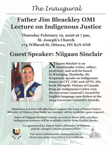 Join us at the free event on the subject of Indigenous Justice with guest speaker Niigaan Sinclair, co-sponsored by St.Joseph's Parish and Kateri Native Ministry of Ottawa.