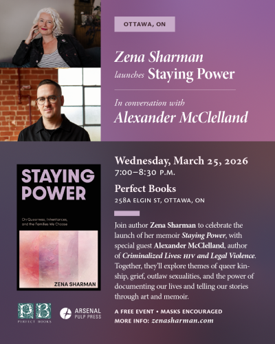 Join author Zena Sharman to celebrate the launch of her memoir Staying Power, with special guest Alexander McClelland, author of Criminalized Lives: HIV and Lgeal Violence. Toegher, they'll explore themes of queer kinship, grief, outlaw sexualities, and the power of documenting our lives and telling our stories through art and memoir.