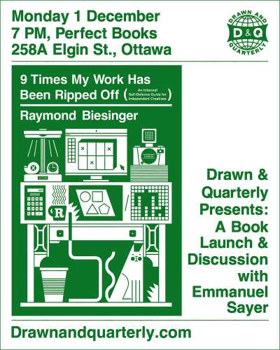 We are delighted to wrap up event season with a launch event for Raymond Biesinger’s latest work, published by Drawn and Quarterly: 9 Times My Work Has Been Ripped Off. Don’t miss this veteran illustrator imparting practical advice for the working creative with candid humor! In conversation with Emmanuel Sayer.